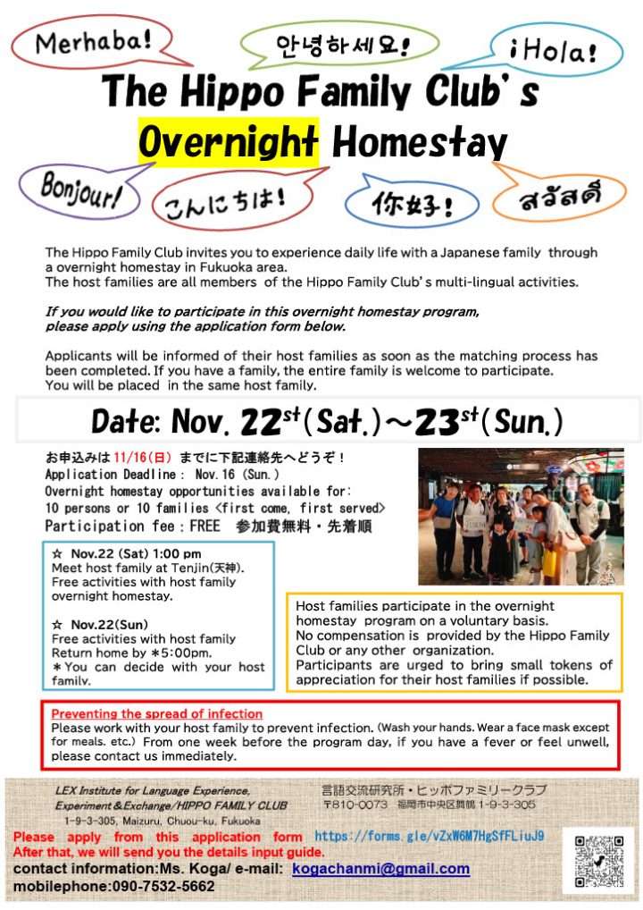 【Application Deadline: 16,Sun】The Hippo Family Club’s Overnight Homestay