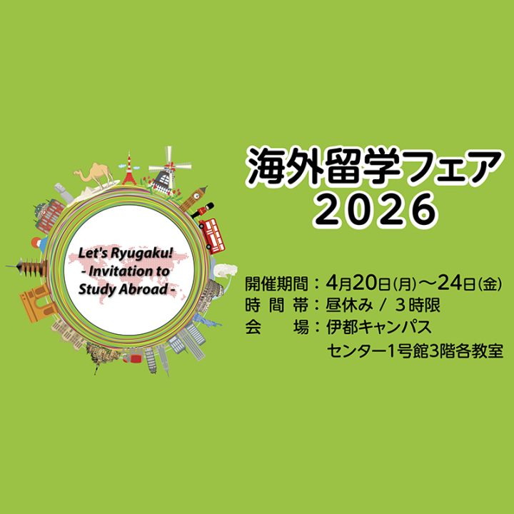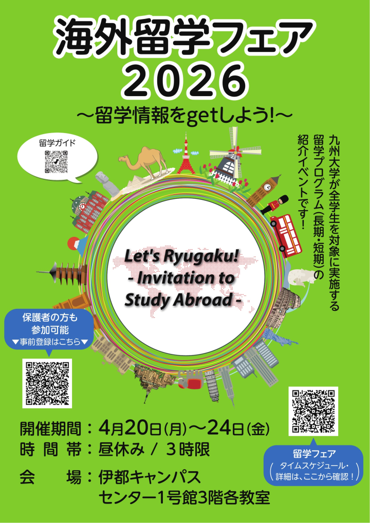 The Study Abroad Fair will be held at Kyushu University's Ito Campus from April 20 to 24, 2026. Feel free to join us.