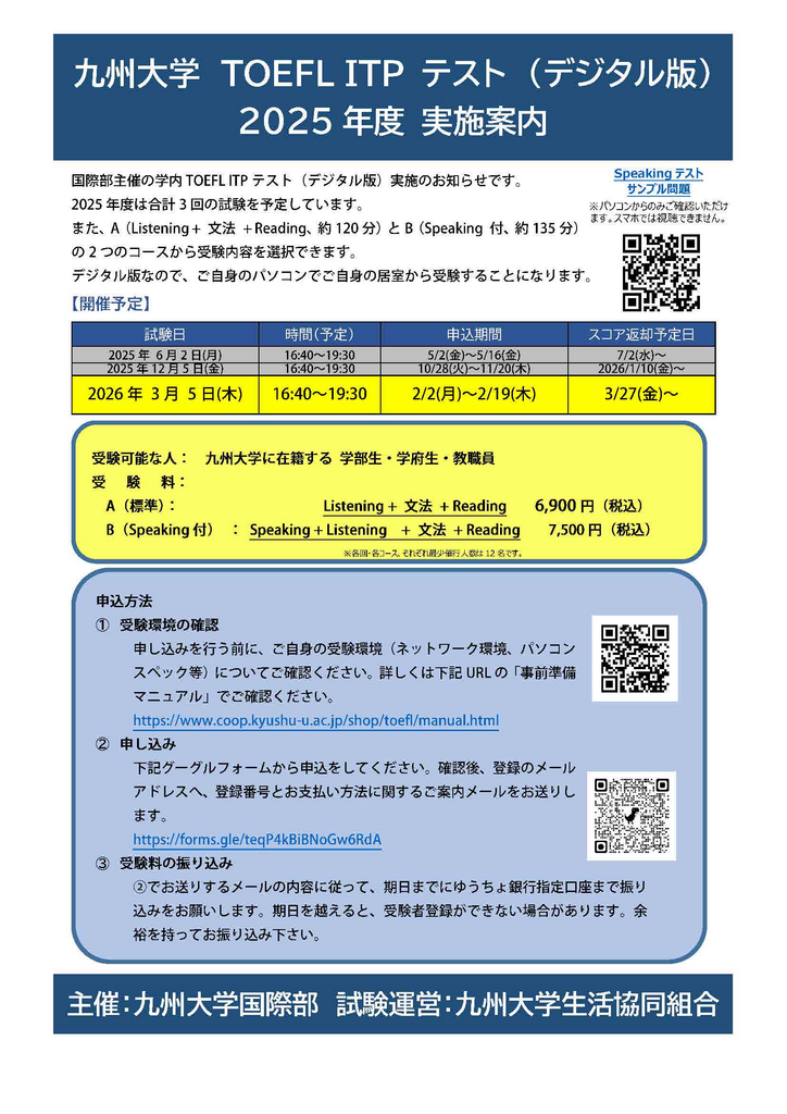 2025年度も、TOEFL ITPテスト(自宅等で受験可能なデジタル版)を6月・12月・3月の3回実施予定で九大生協にて申込できます!